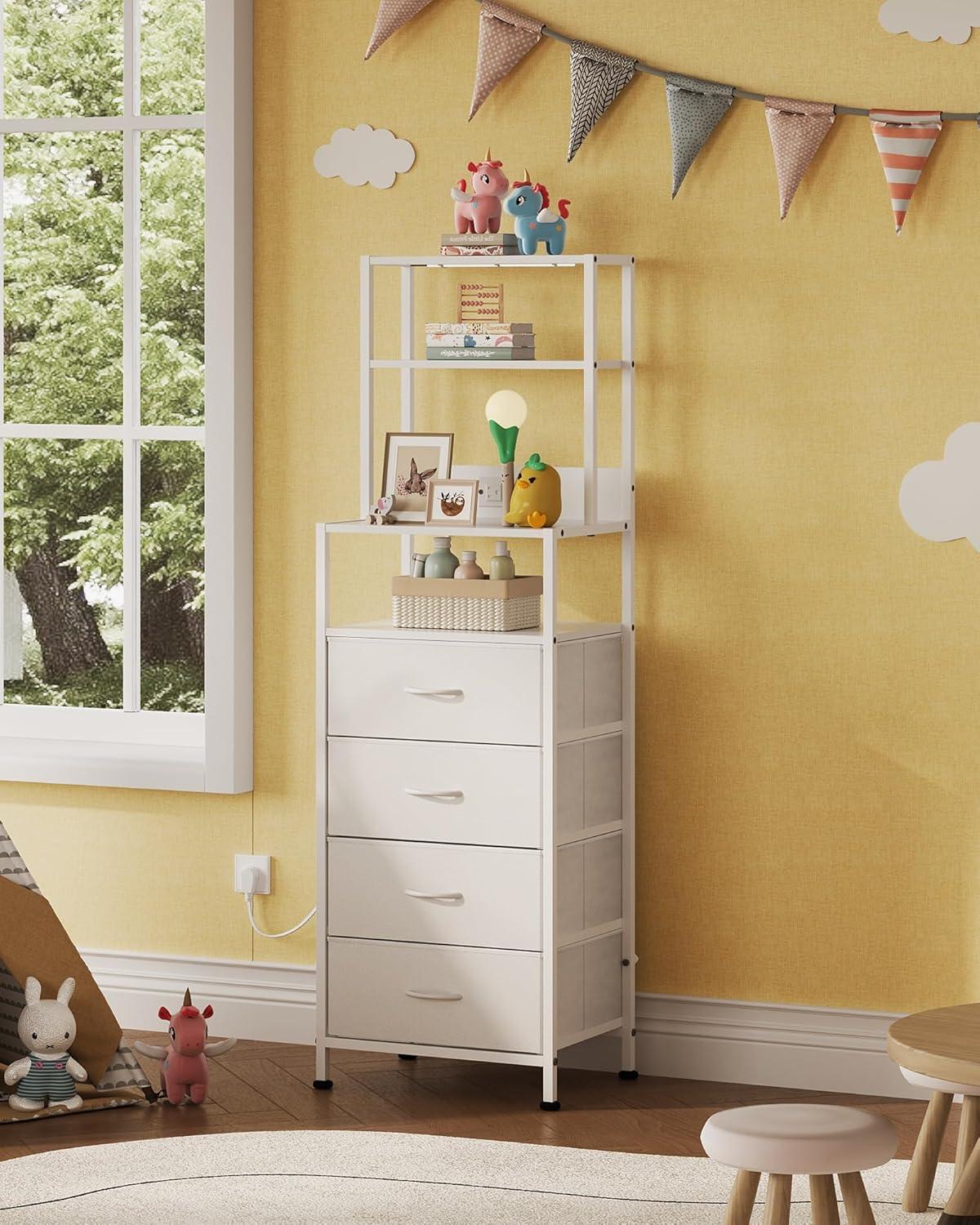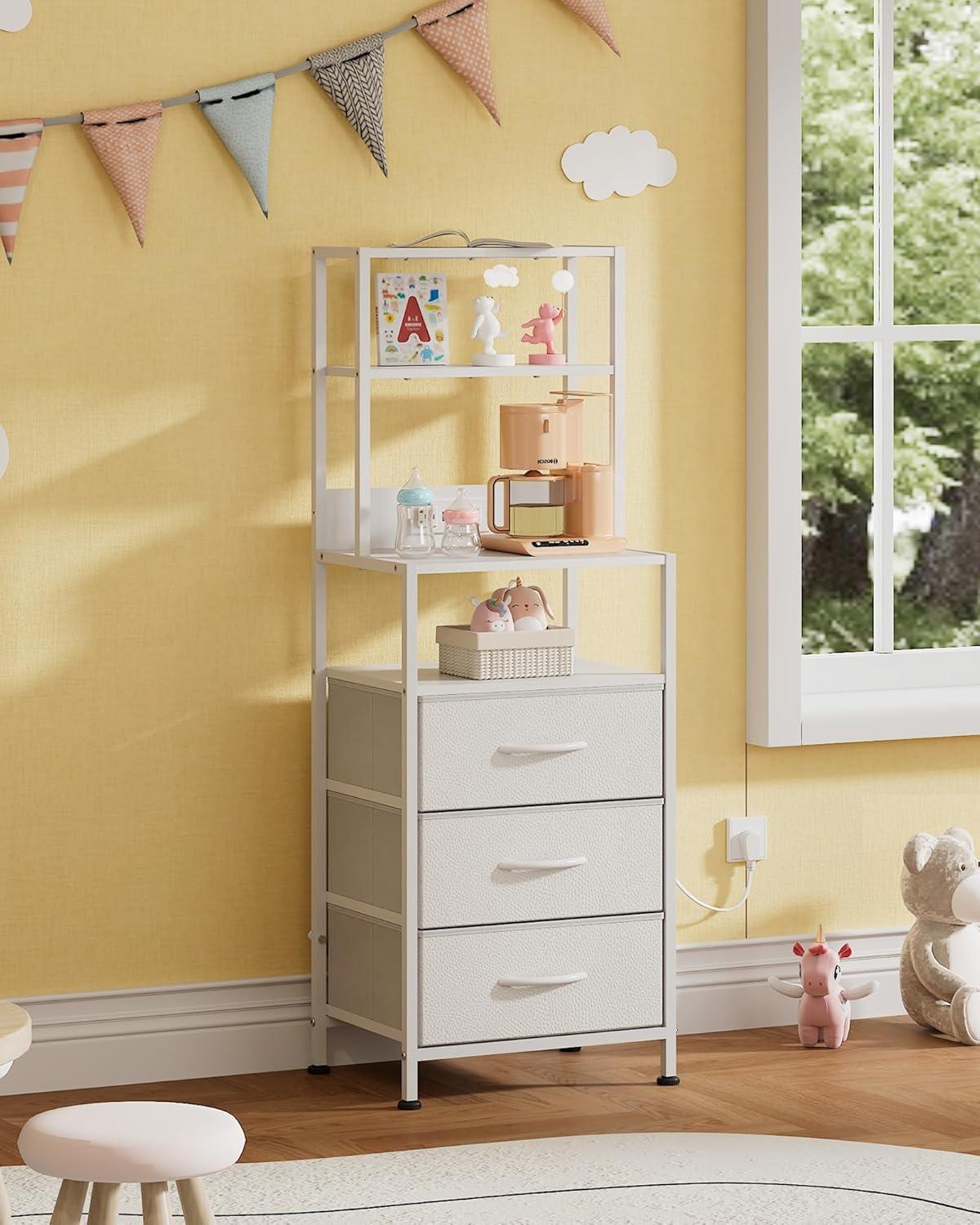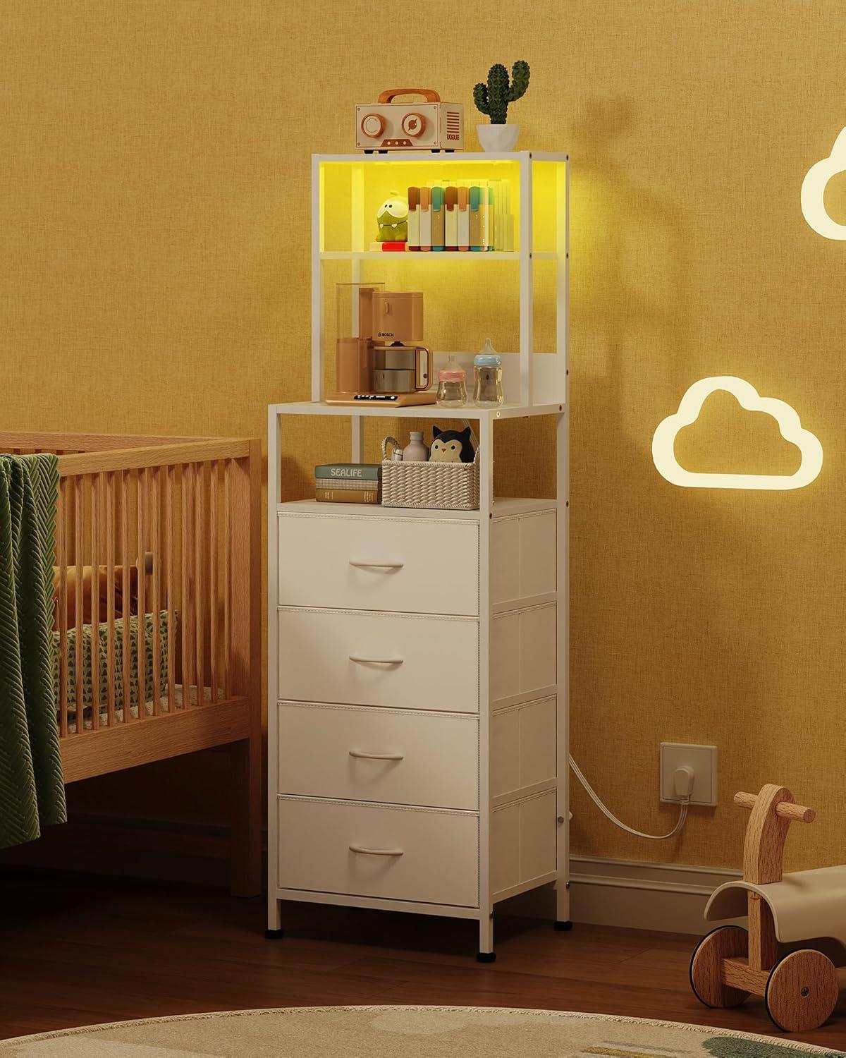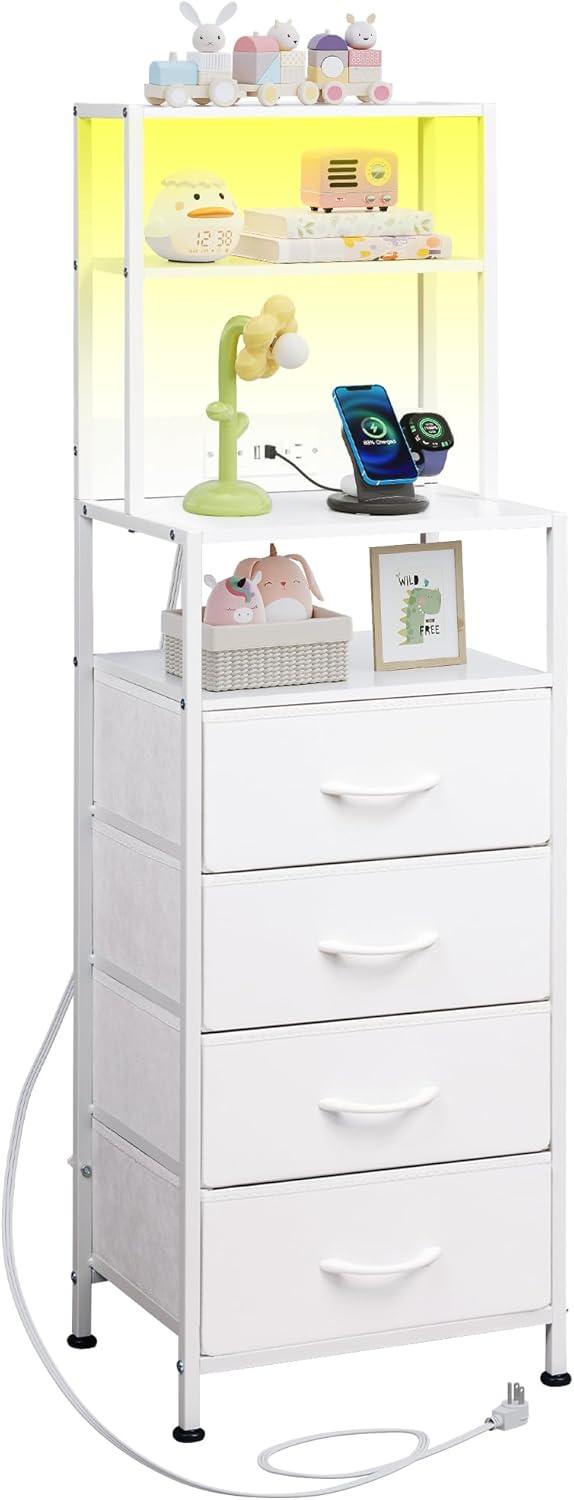 WLIVE Tall White Nightstand with Charging Station, LED Night Stand with 3 Fabric Drawers and Storage Open Shelves, Bedroom Nightstand Table, Bed Side Table for Living Room(White)