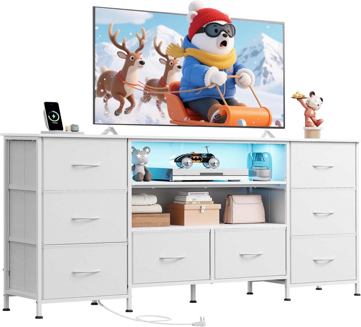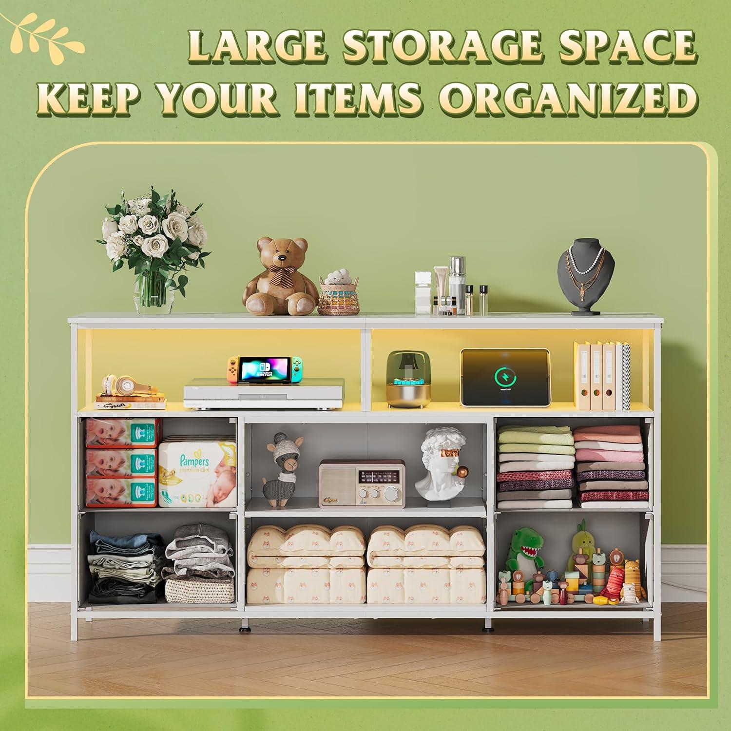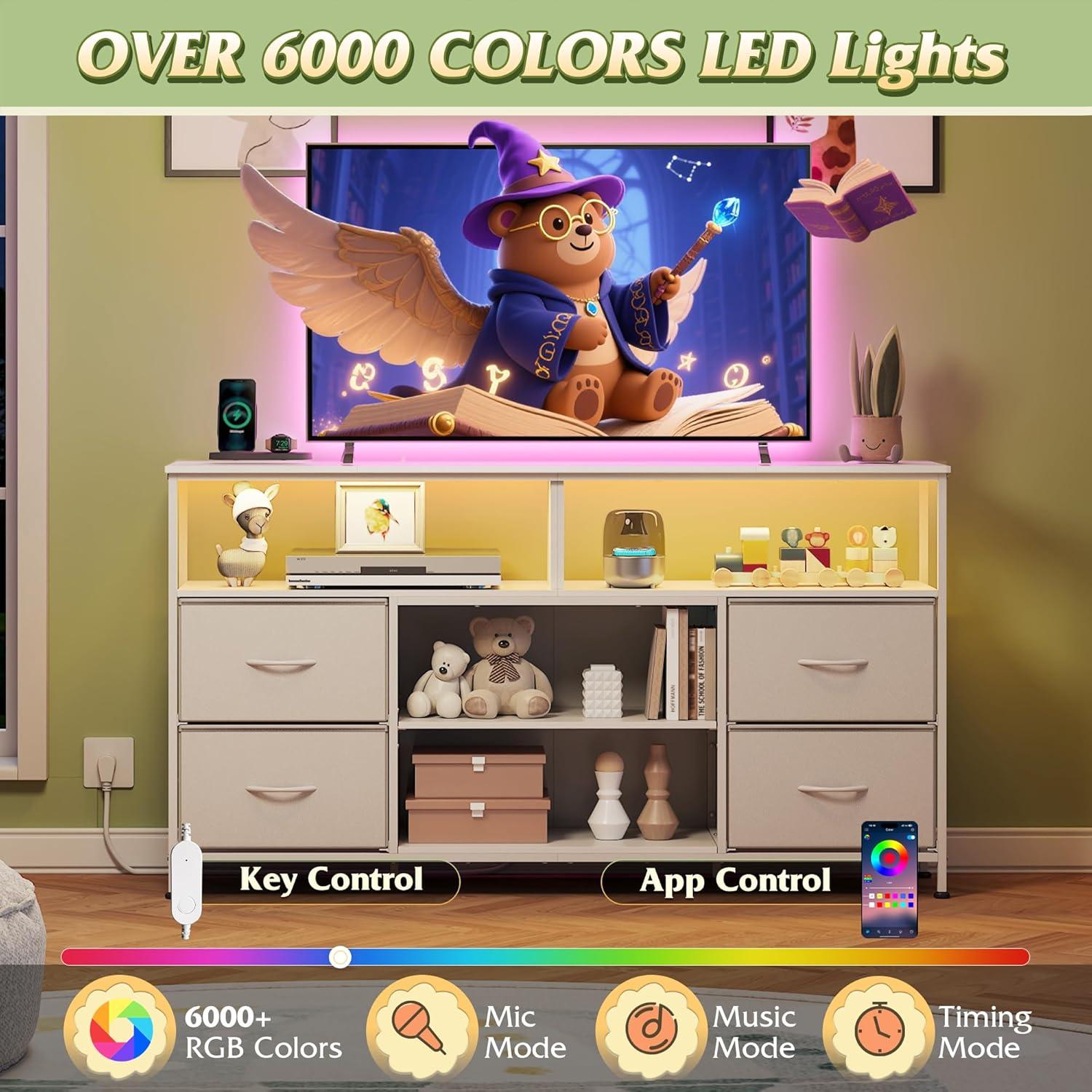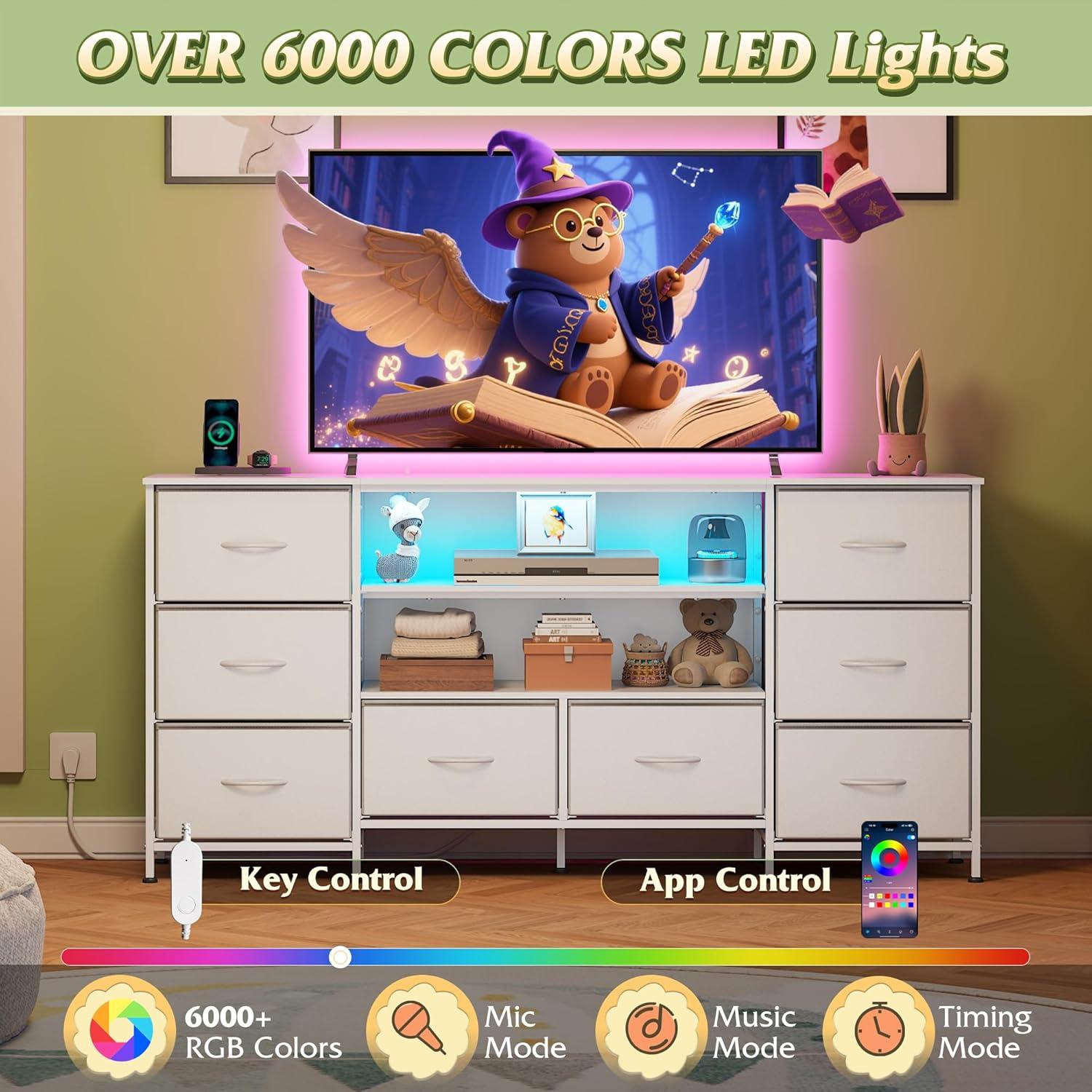 WLIVE TV Stand Dresser for 50,55,60 inch TV, Entertainment Center with LED Lights & Fabric Drawers, Dresser TV Stand for Bedroom and Living Room with Open Shelves, Rustic Brown(White)