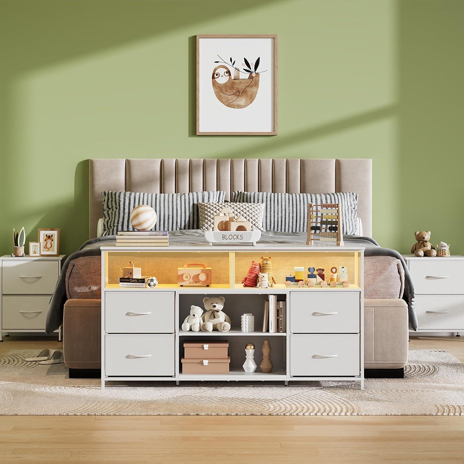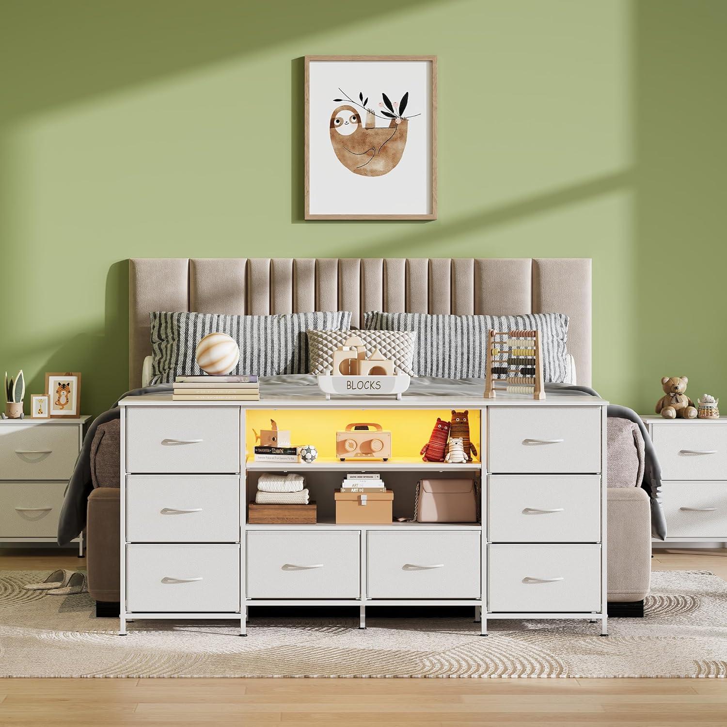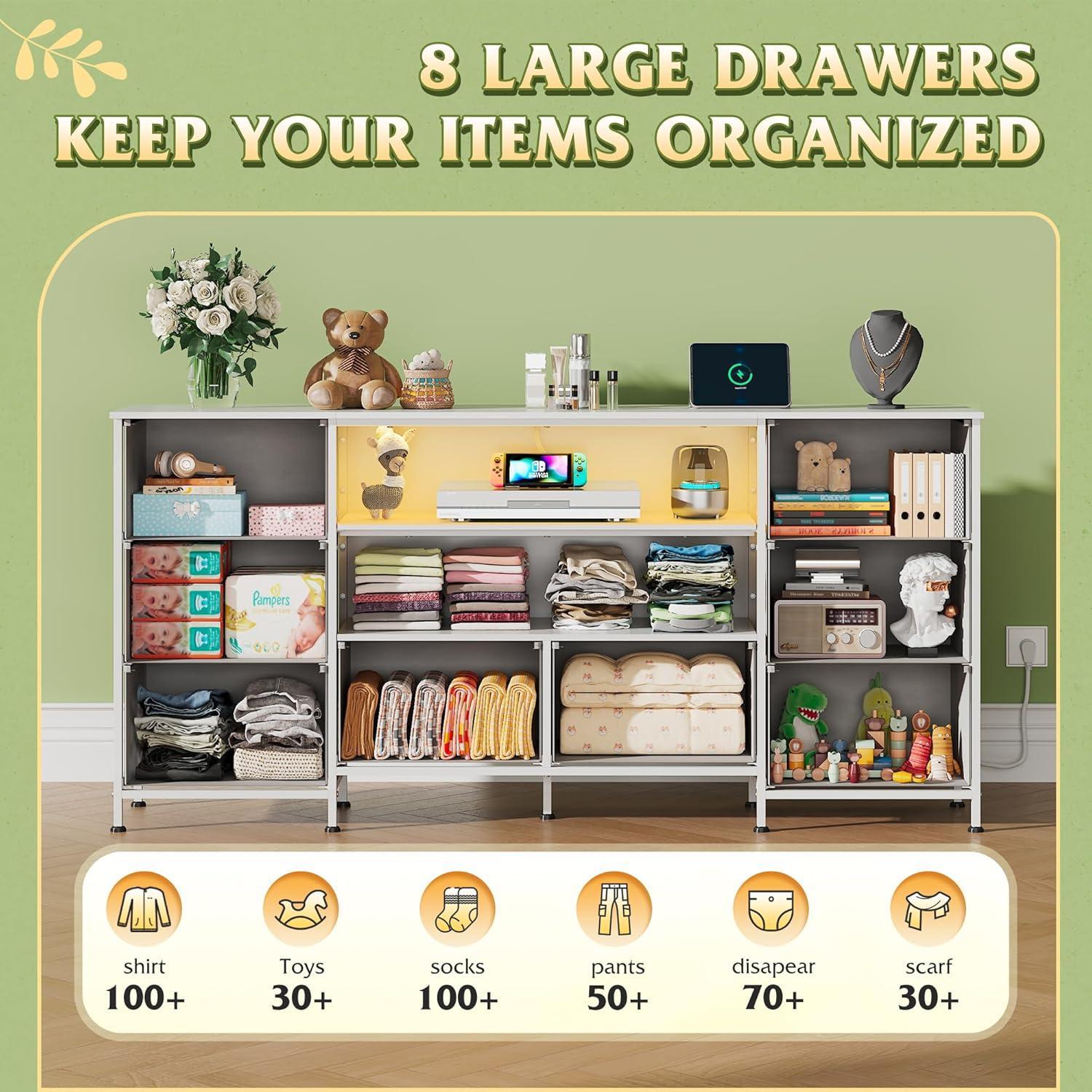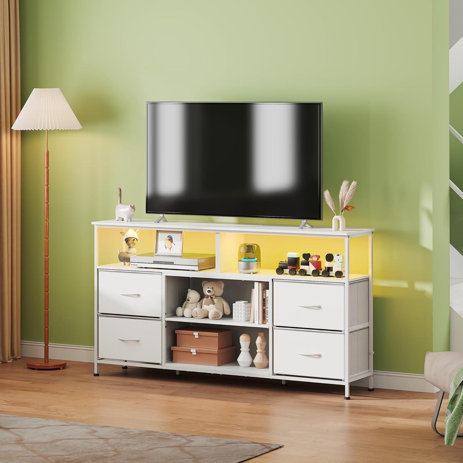 WLIVE TV Stand Dresser for 50,55,60 inch TV, Entertainment Center with LED Lights & Fabric Drawers, Dresser TV Stand for Bedroom and Living Room with Open Shelves, Rustic Brown(White)