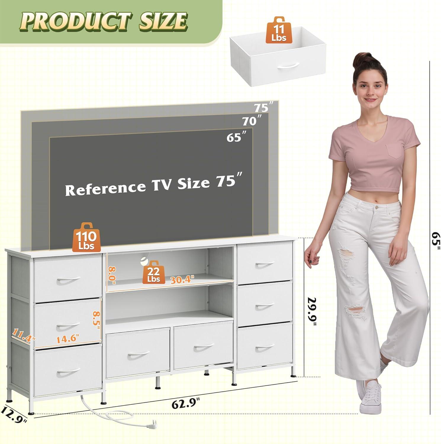 【🏠 Ample Storage TV Stand】Measures 55.1″W x 30.3″D x 12.9″H, 50/55/60'' TV can be placed, our media console is equipped with 8 detachable fabric drawers and spacious woodtop, which facilitate the orderly storage of entertainment equipment and daily items, while the desktop provides display space for artworks and small ornaments, and more life style!