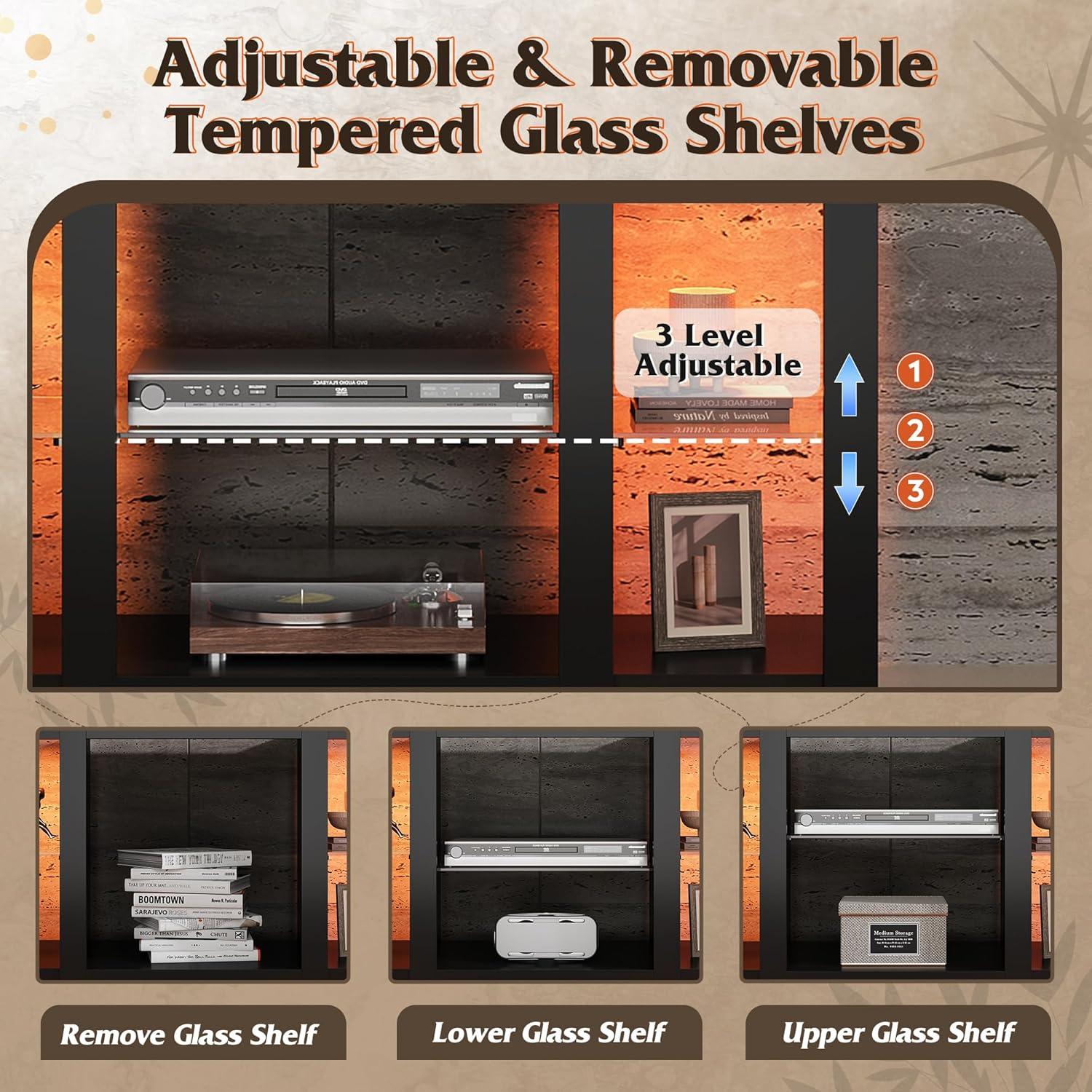 【Smart Storage Solution】With a 15.4″ profile, this television stand tucks neatly into tight spaces.Three adjustable tempered glass shelves allow for customizable storage, keeping media devices, gaming systems, and DVDs organized and the open design allows for easy access and cleaning