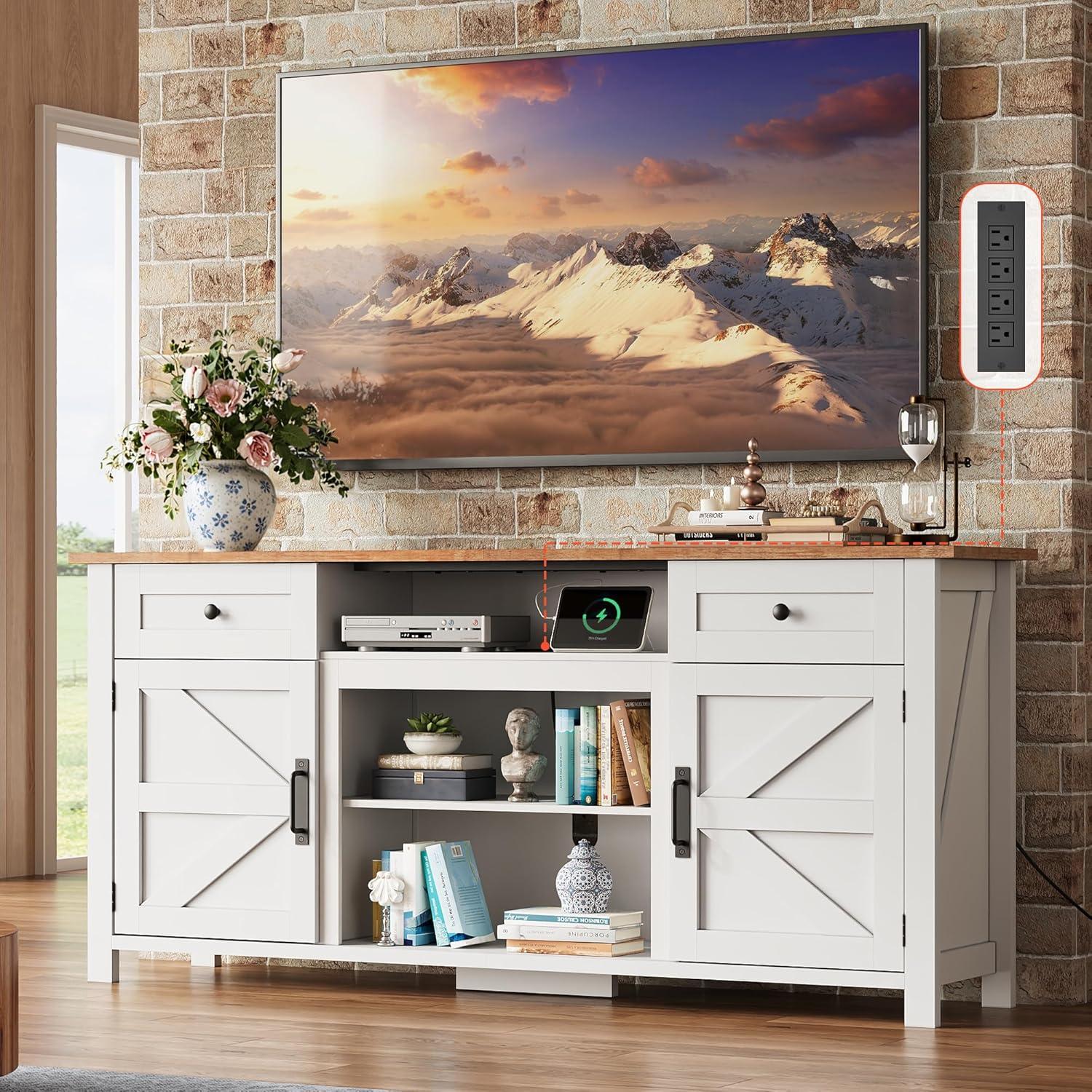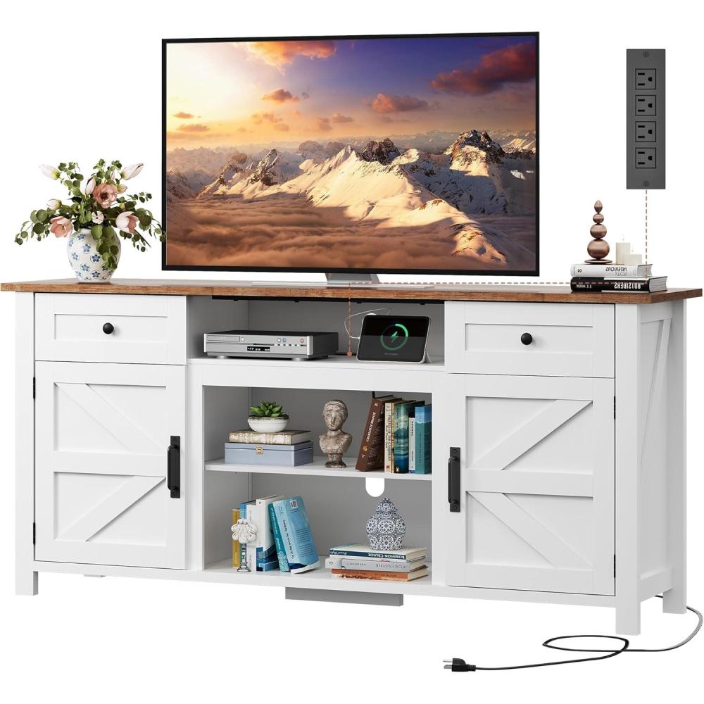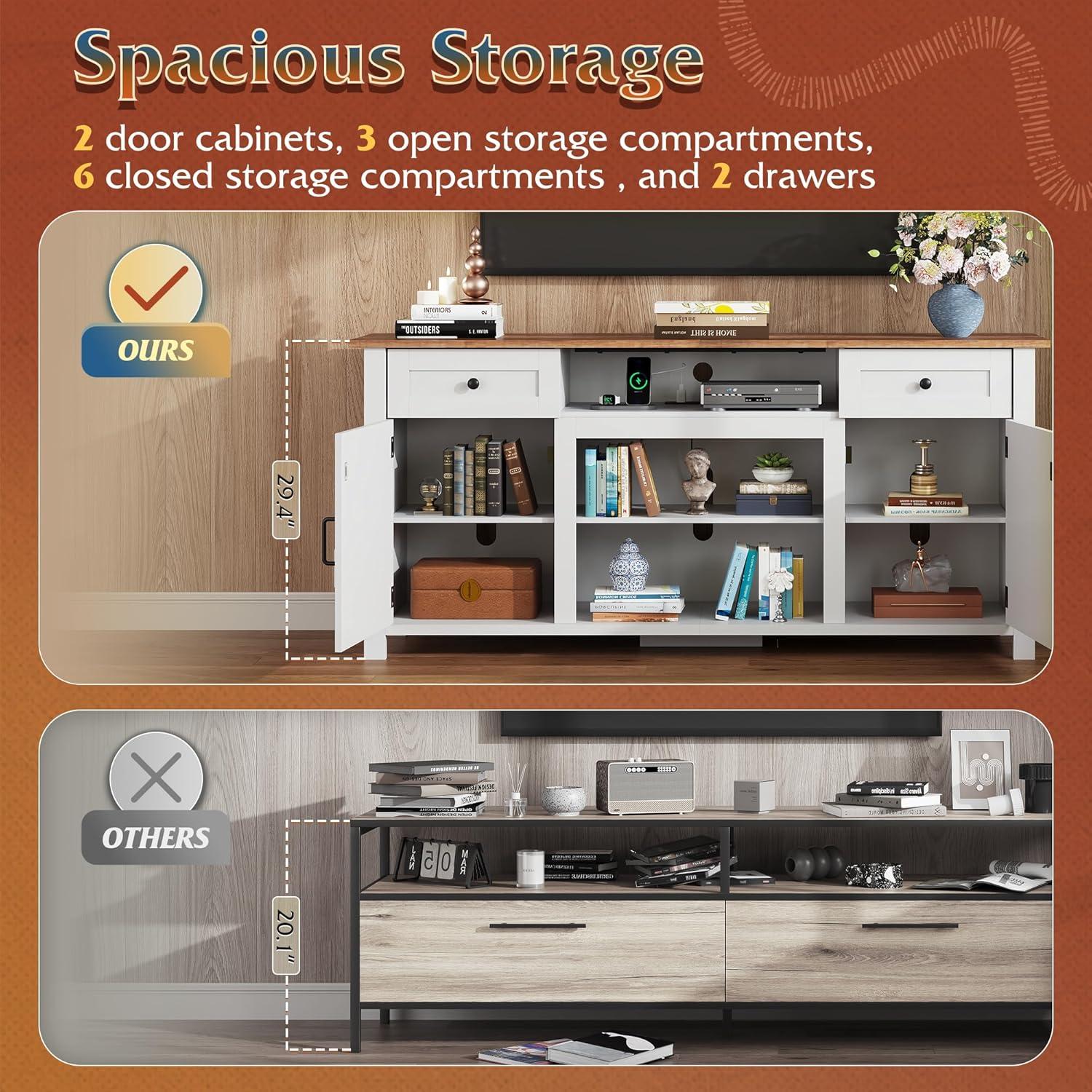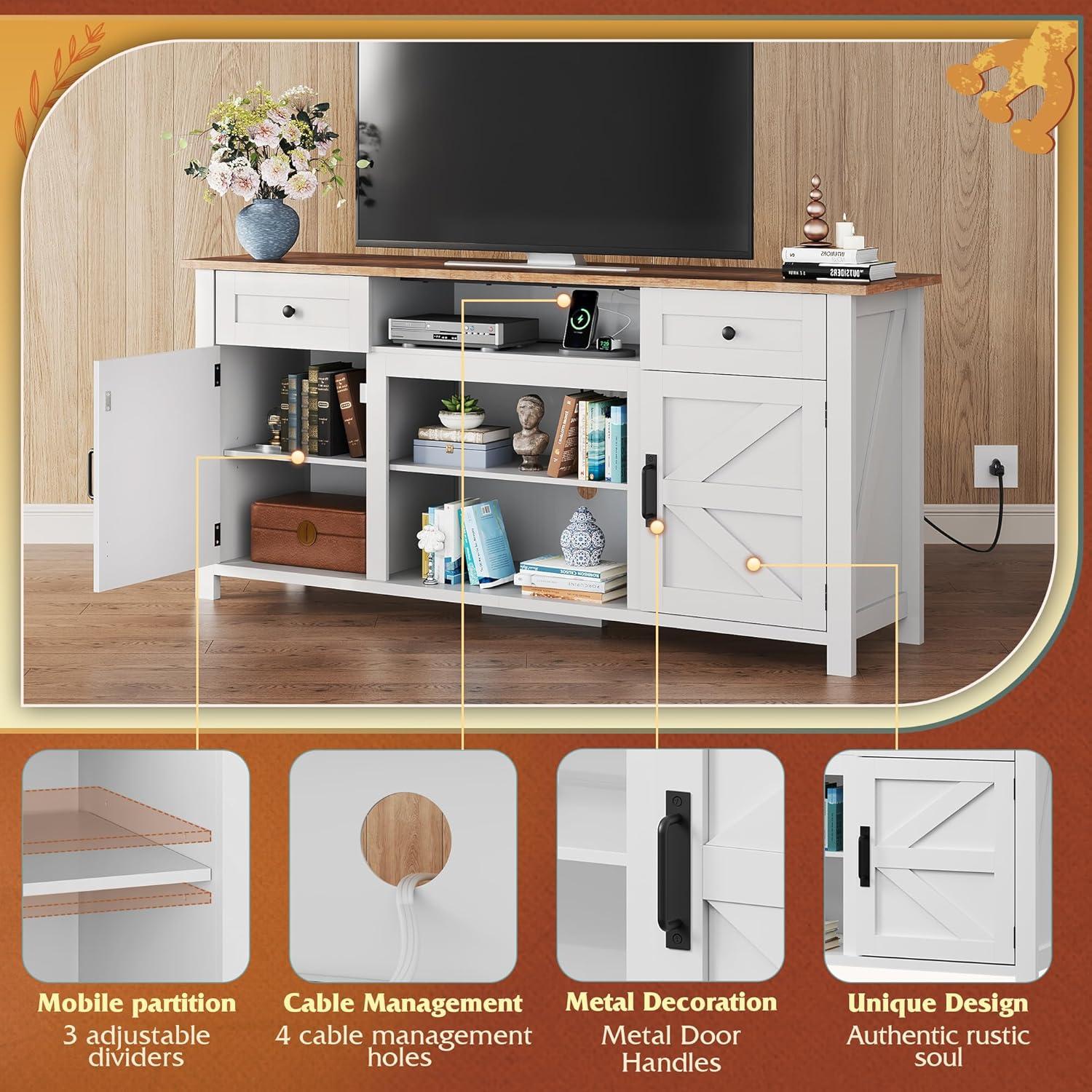 Modern Farmhouse Style with Functional Details: Blending rustic charm with contemporary function, this TV stand features magnetic soft-close doors and an anti-tip design for added stability. Its thoughtful layout and refined finish elevate any living space with both character and practicality