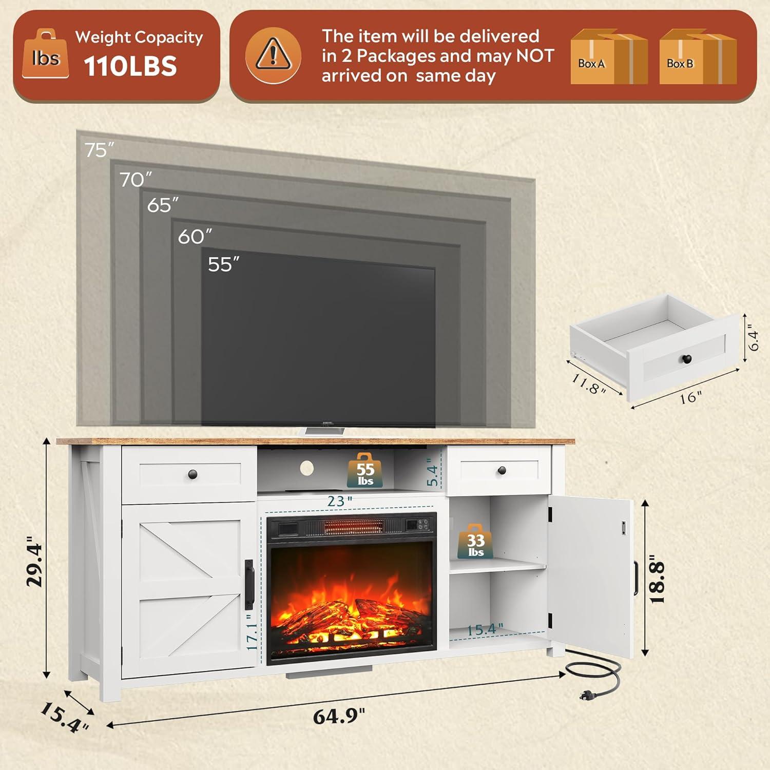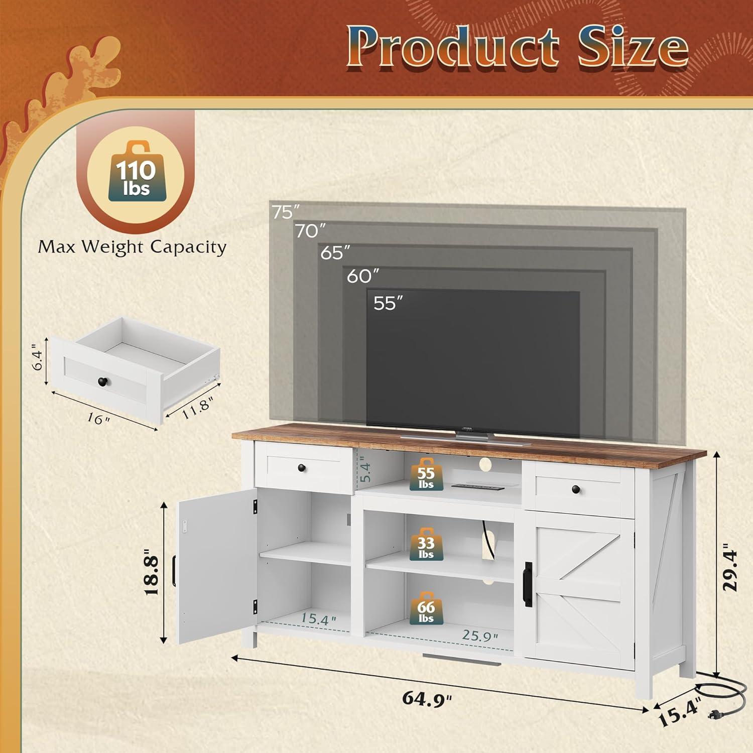 Spacious & Sturdy Design: Size: 64.96″W×15.4″D×29.4″H. This TV stand is designed to perfectly accommodate televisions ranging from 55 to 75 inches, with a solid 65-inch wide top. Crafted from high-quality materials for lasting durability, its robust construction ensures reliable support for TVs up to 65 inches, offering both safety and a generous surface for media setup