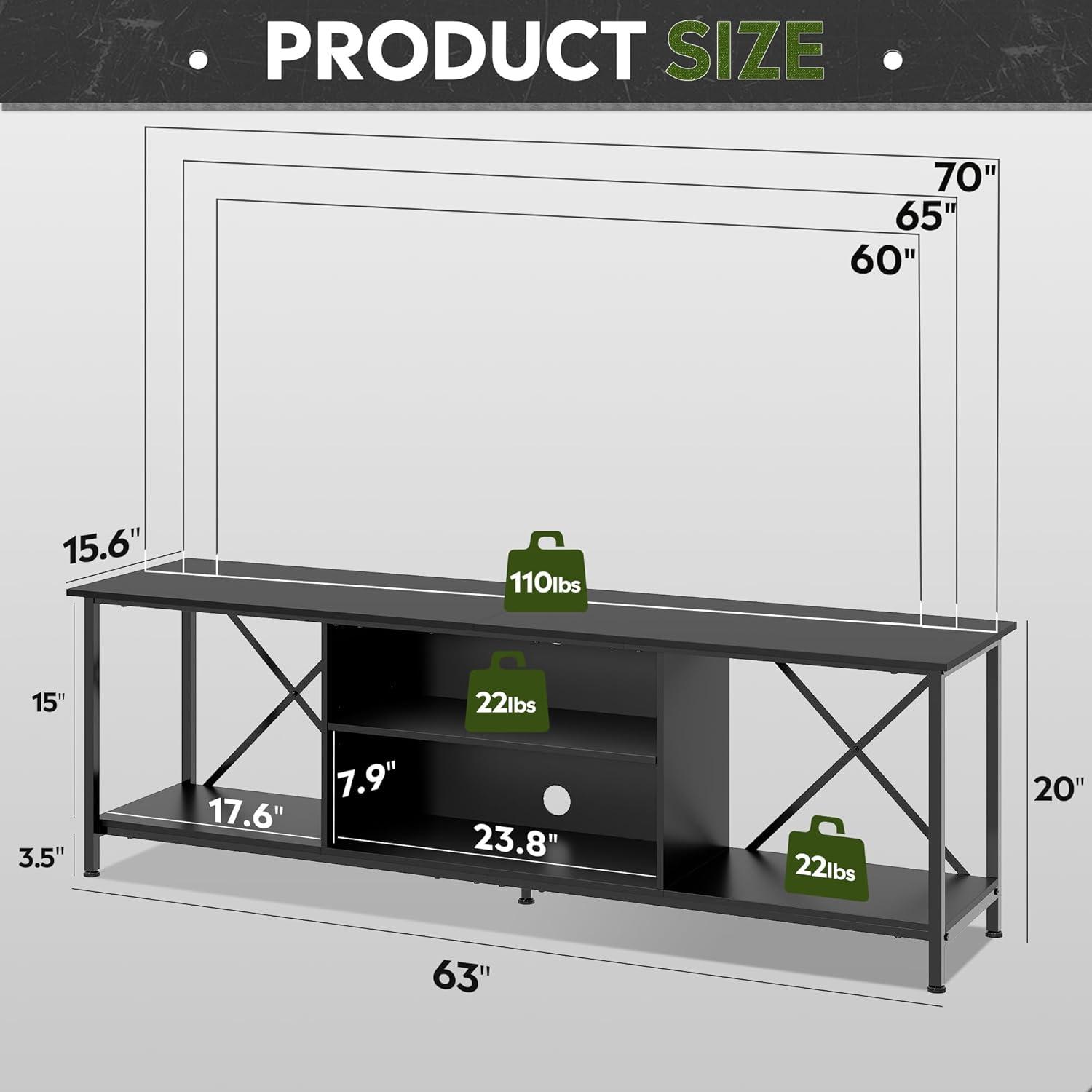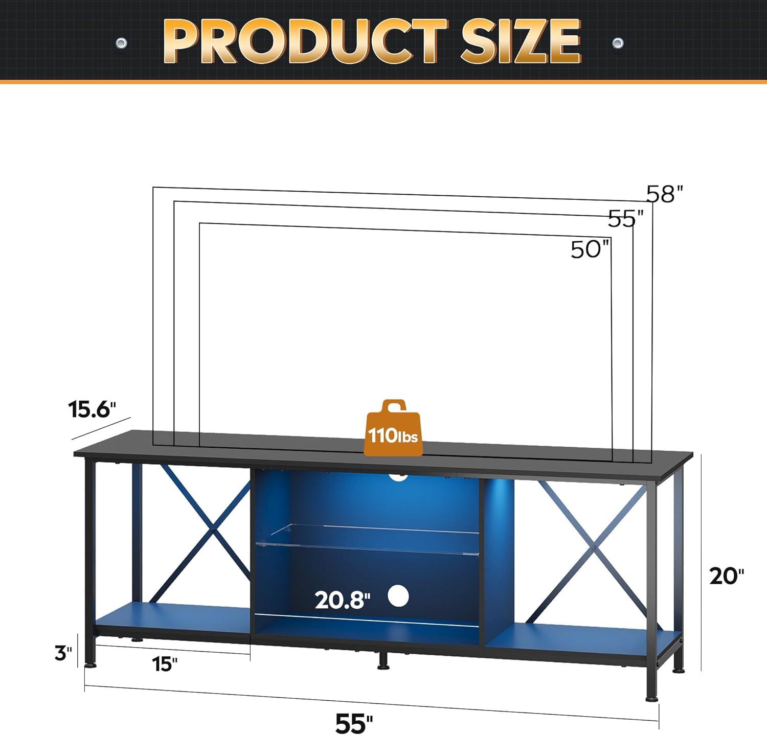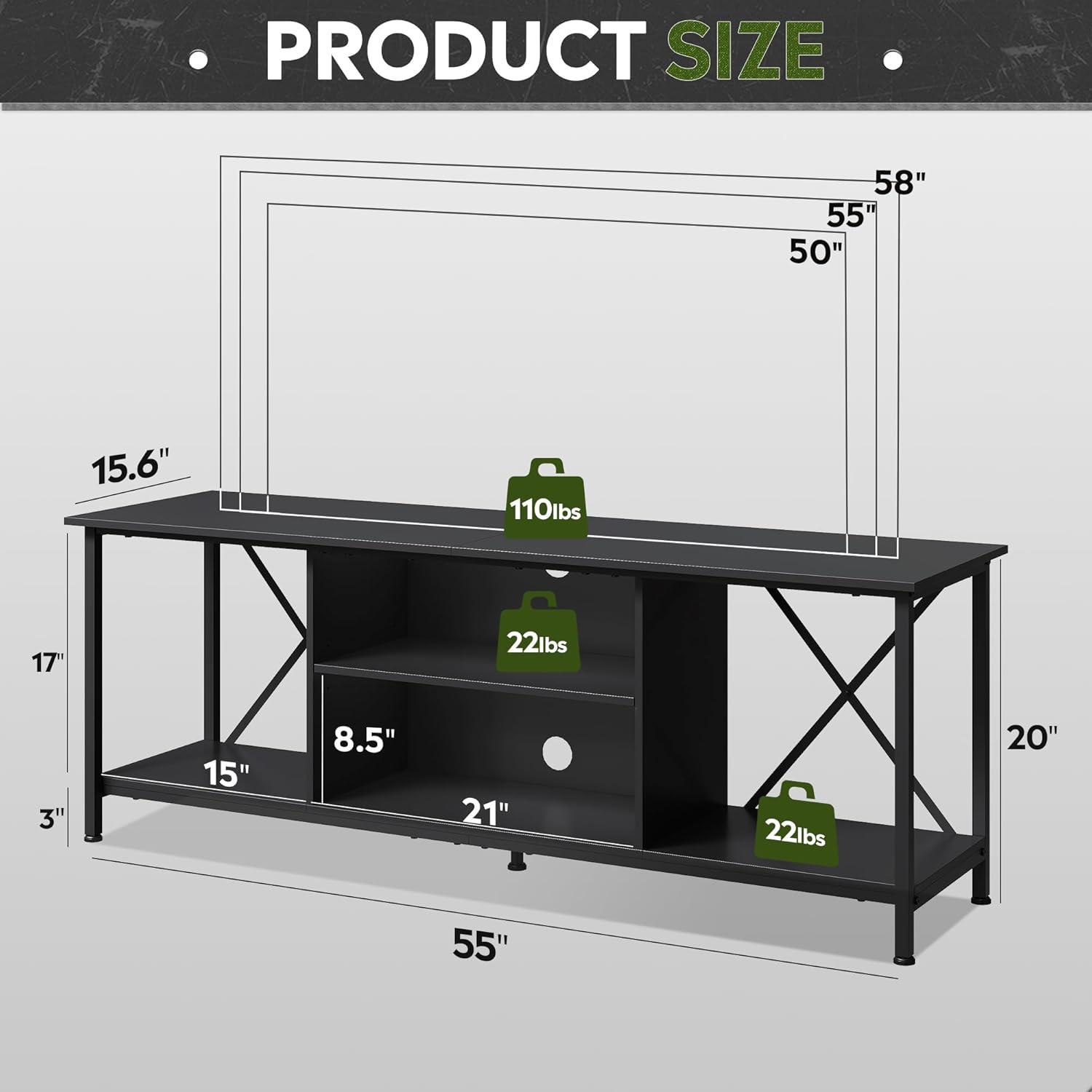 【Industrial Style】With high quality particle board and metal frame forms the industrial style.The rear X-Frame keeps the stability while enhancing the industrial style.The TV stand overall size is 55.04″L x15.67″W x 20.16″H fits for up to 65 inch TV. It is not only meets your daily storage needs, but also can be a bright decoration for living room.
