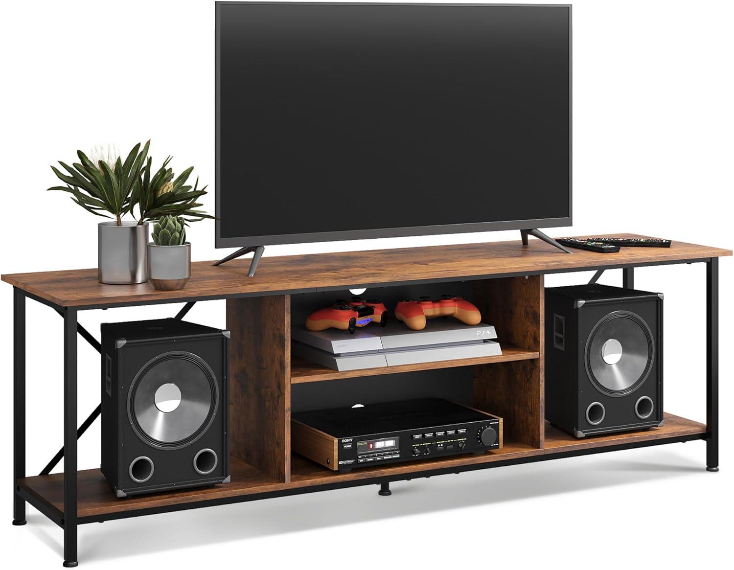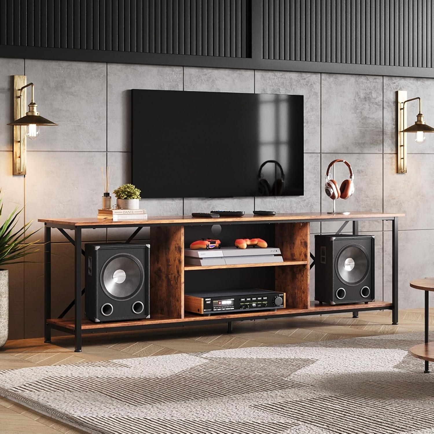 【Spacious Storage】Extra high open storage shelves on both sides of TV console allow you to store taller items such as vertical speakers,which also conducive to the heat dissipation of electronic equipment.The TV stand features 3-tier open adjustable shelf in the middle, it can meet your different storage needs. Definitely a must-have for you to improve your home happiness!