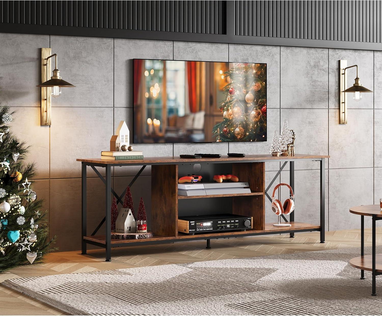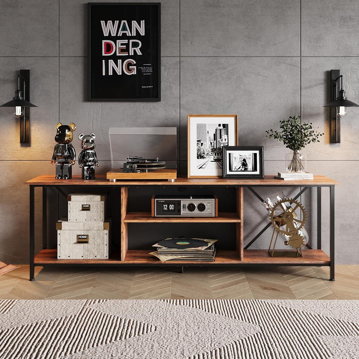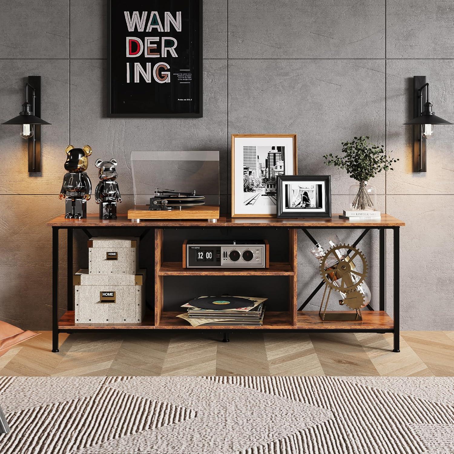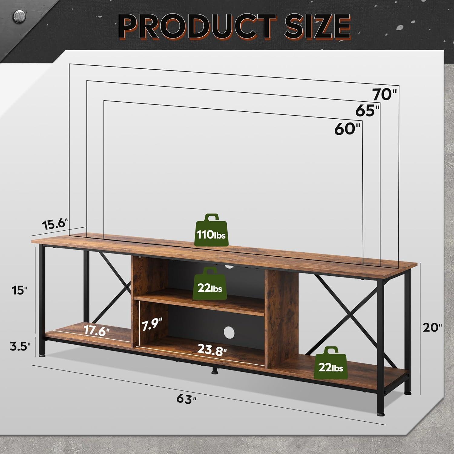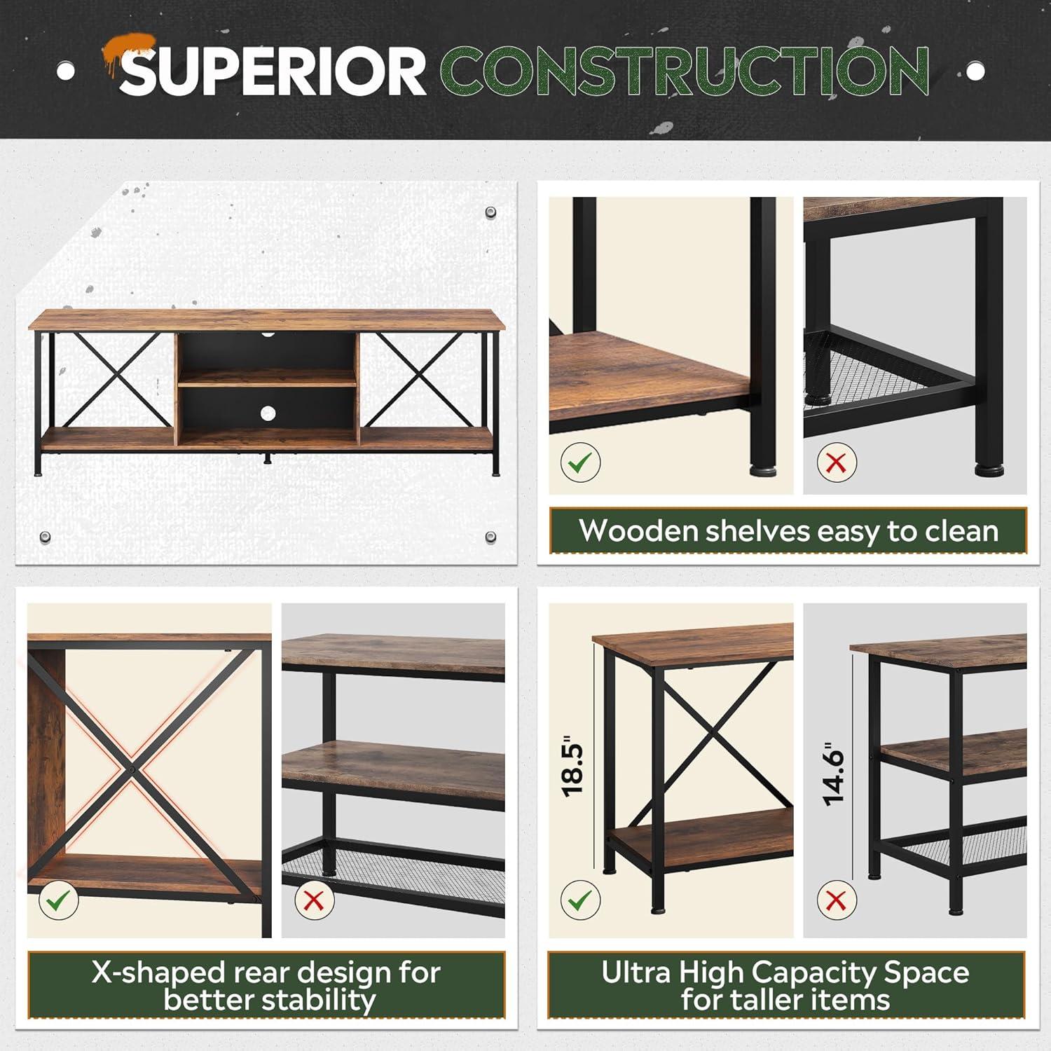 【Industrial Style】With high quality particle board and metal frame forms the industrial style.The rear X-Frame keeps the stability while enhancing the industrial style.The TV stand overall size is 55.04″L x15.67″W x 20.16″H fits for up to 65 inch TV. It is not only meets your daily storage needs, but also can be a bright decoration for living room.