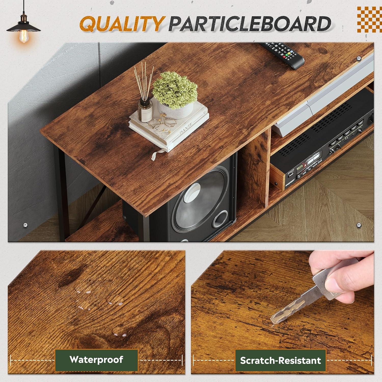 【Sturdy and Stable】The entertainment center is constructed with high quality particle board and metal frame to build a stable structure that provides strong weight-bearing performance,and the top can hold up to 110 pounds.It was also equipped with plastic adjustable feet to help stabilize uneven floors or carpets.