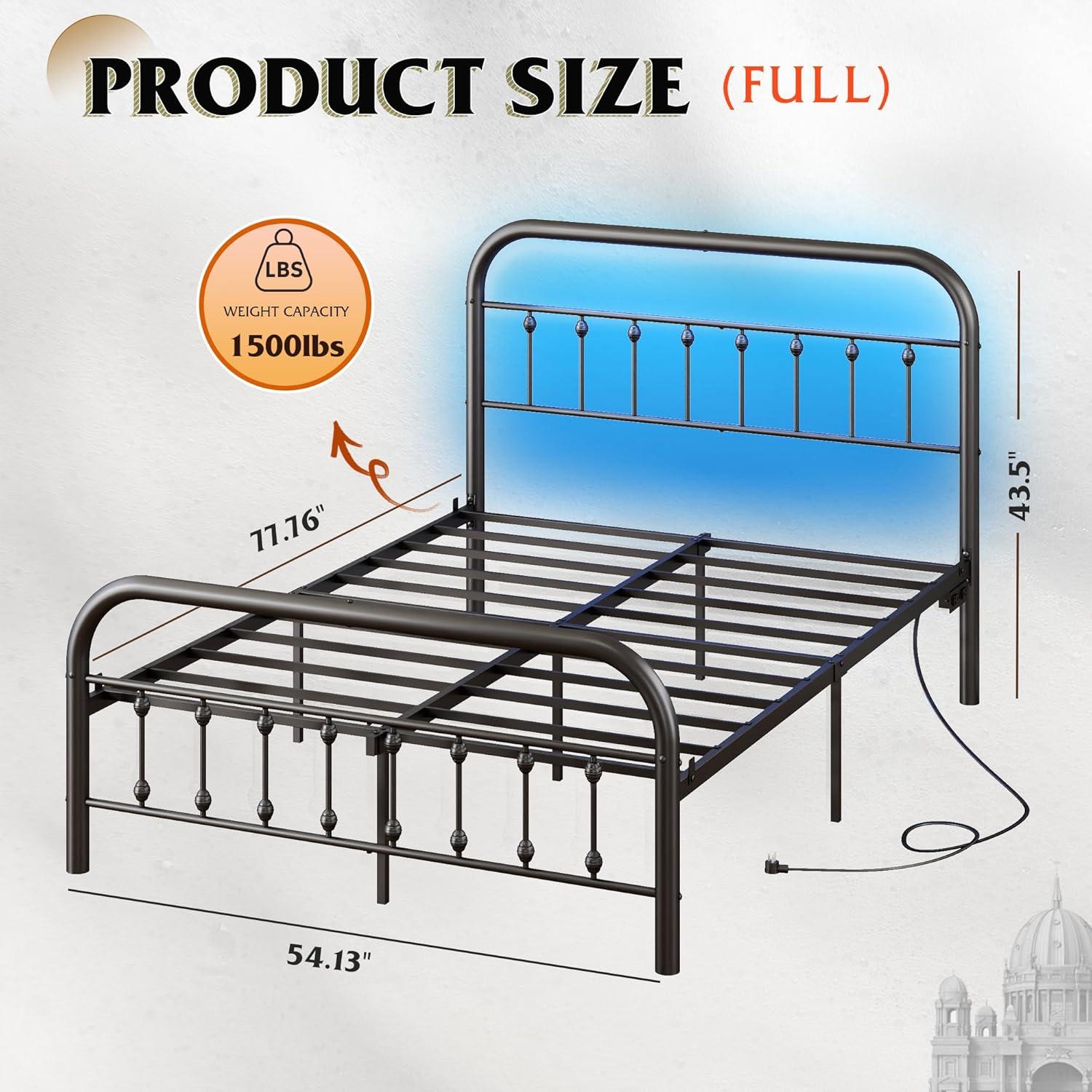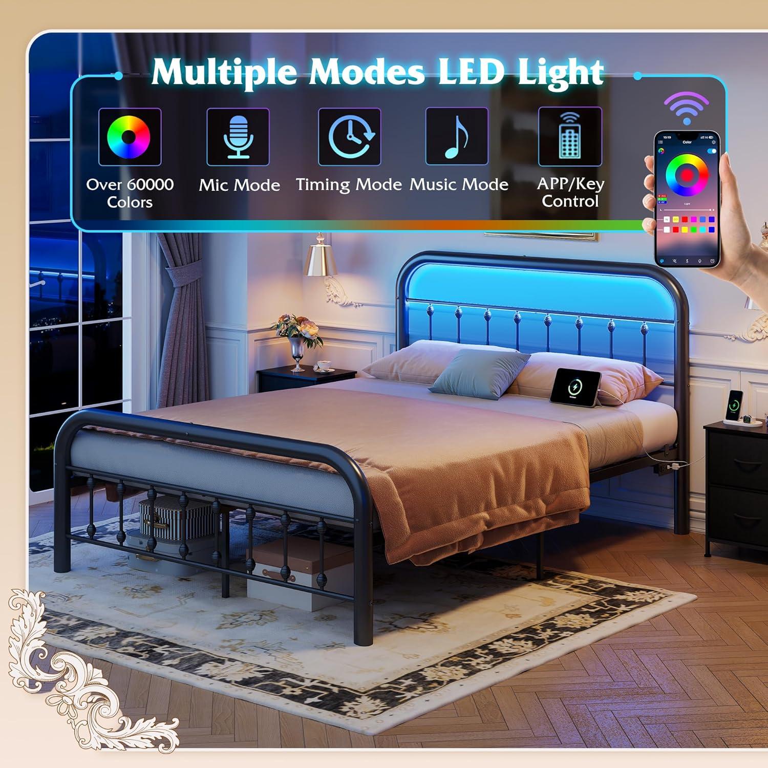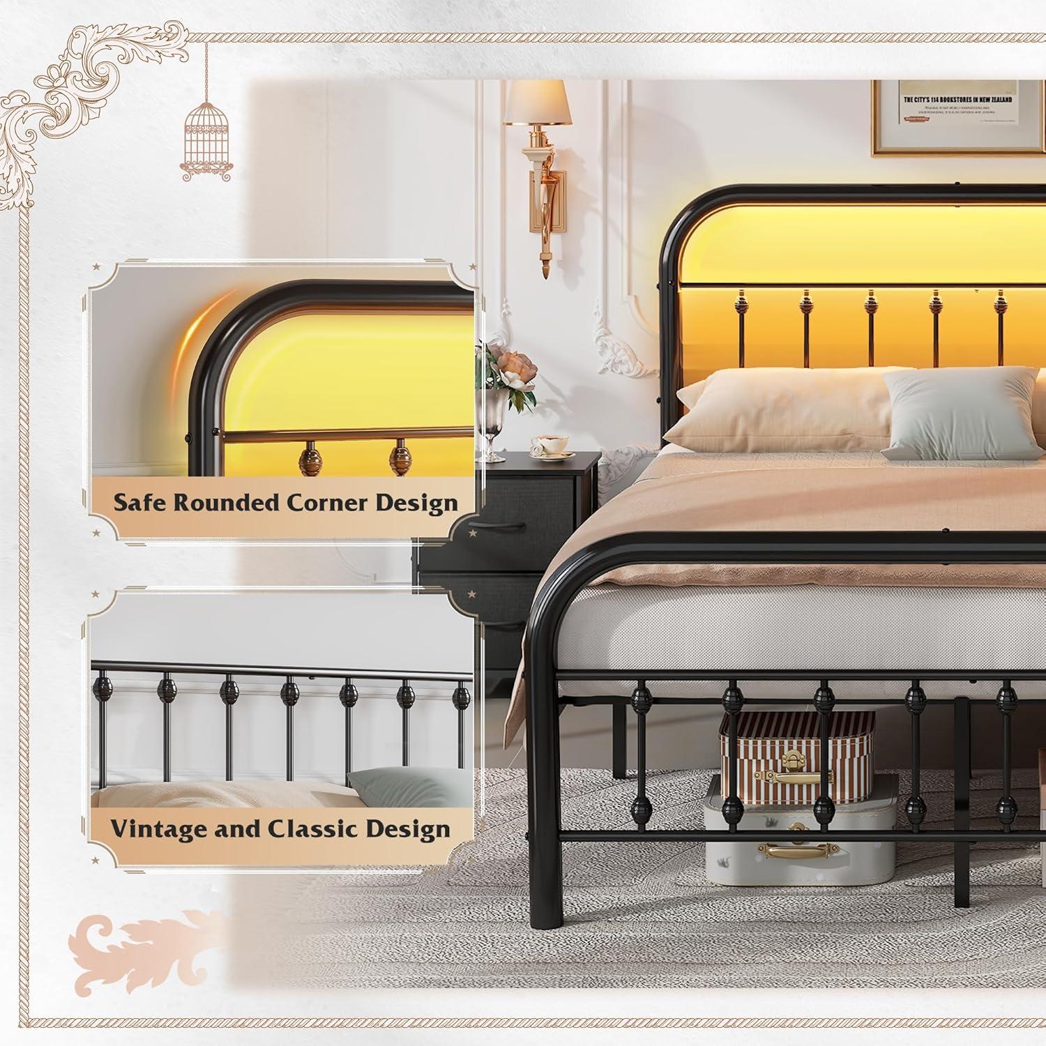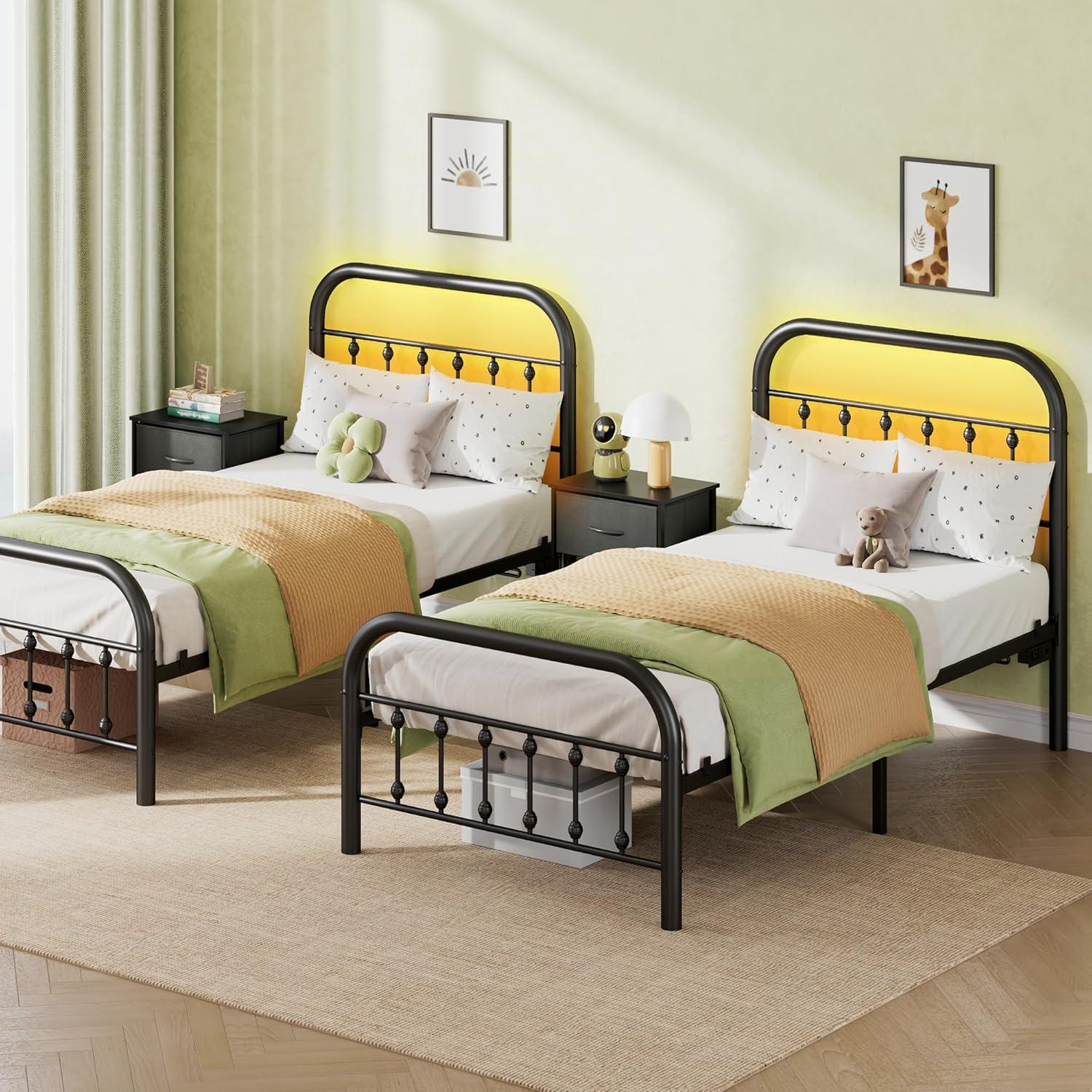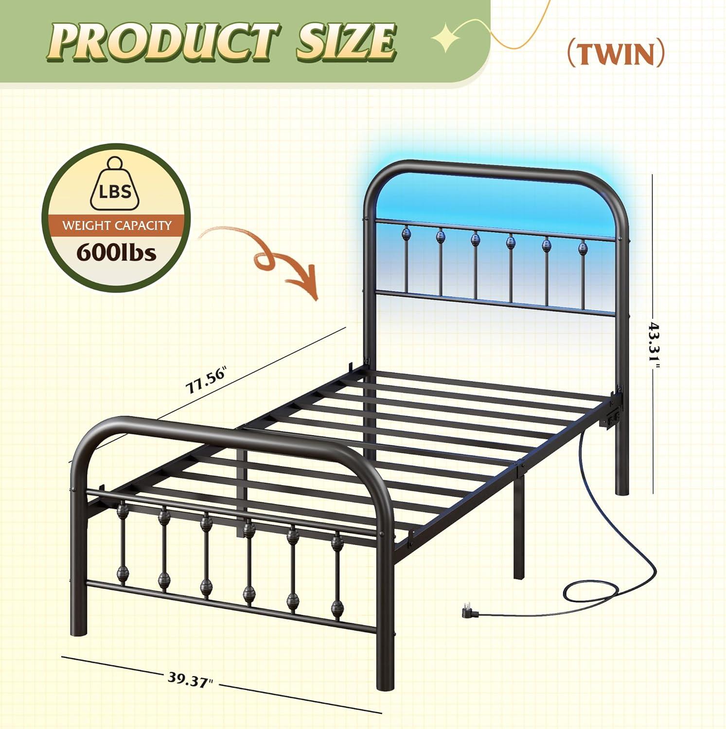 WLIVE Twin Bed Frame, Twin Size Bed Frames with LED Lights and Charging Station, Metal Bed Frame with Headboard, No Box Spring Required,Easy Assembly,White(Black)