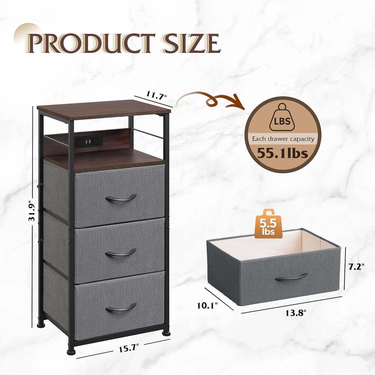 WLIVE White Night Stand with Charging Station, LED Nightstand with 3 Fabric Drawers, Tall Bedside Table with 3 USB Ports and 2 Outlets, Dresser for Small Space, 31.93″ H Side Table for Bedroom(Dark Grey)