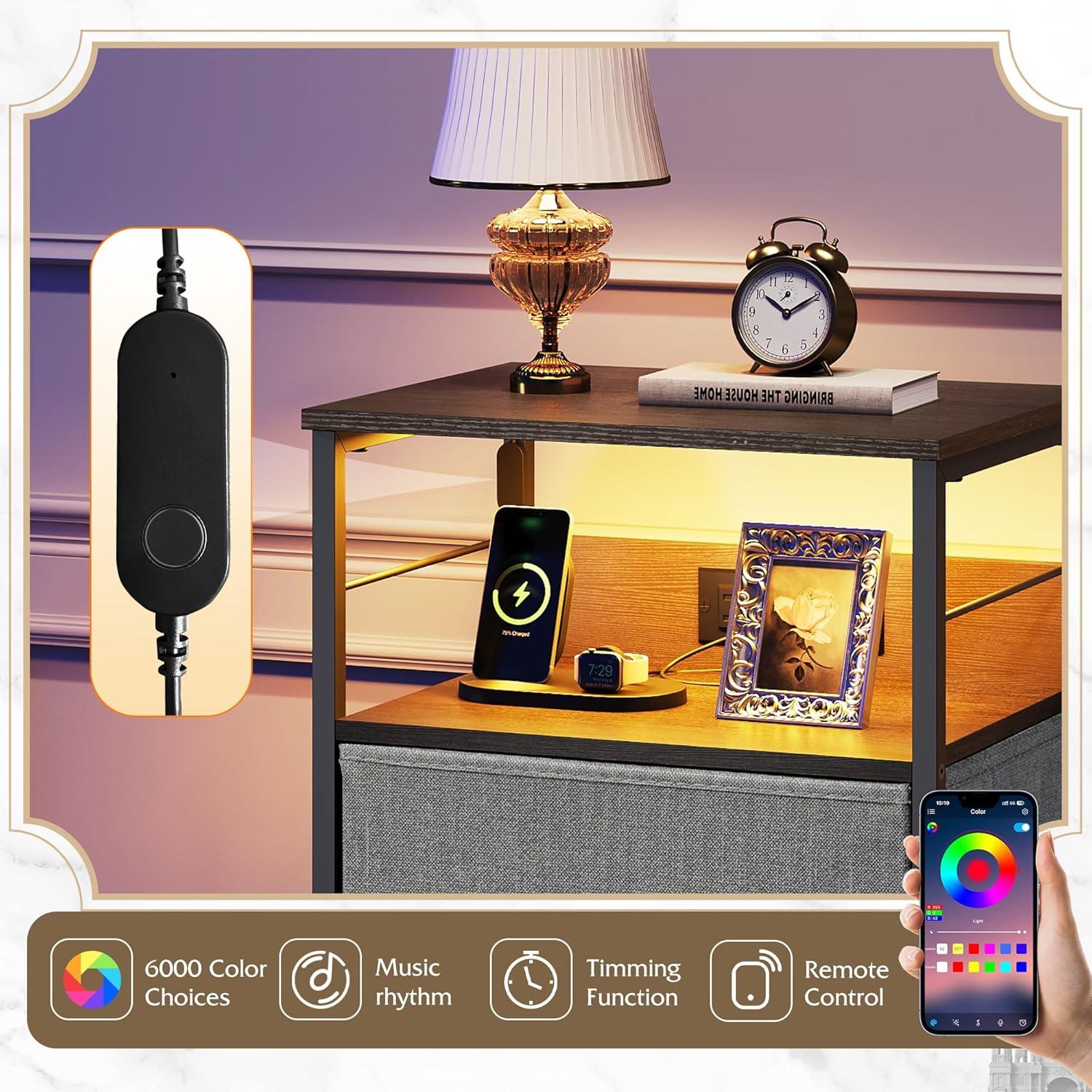 imageWLIVE White Night Stand with Charging Station LED Nightstand with 3 Fabric Drawers Tall Bedside Table with 3 USB Ports and 2 Outlets Dresser for Small Space 3193quot H Side Table for BedroomCharcoal Black Wood Grain Print