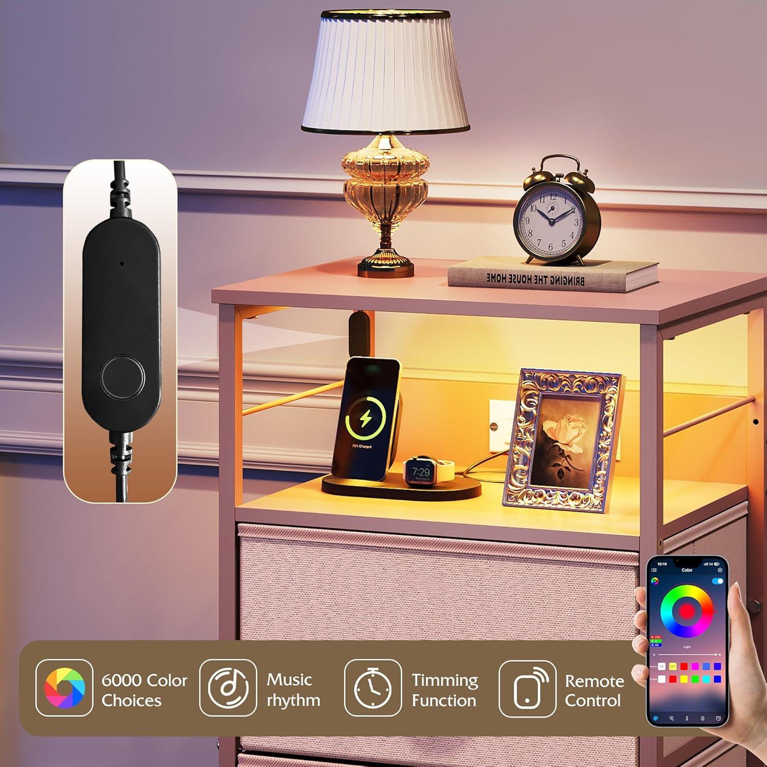 [LED Nightstand] Enhance your bedroom with this night stand featuring a colorful LED light strip. You can control the color changes and turn the lights on or off using your phone's app. The brightness of the bed side table is adjustable, allowing you to create a soothing atmosphere that helps you relax and drift off to sleep peacefully.