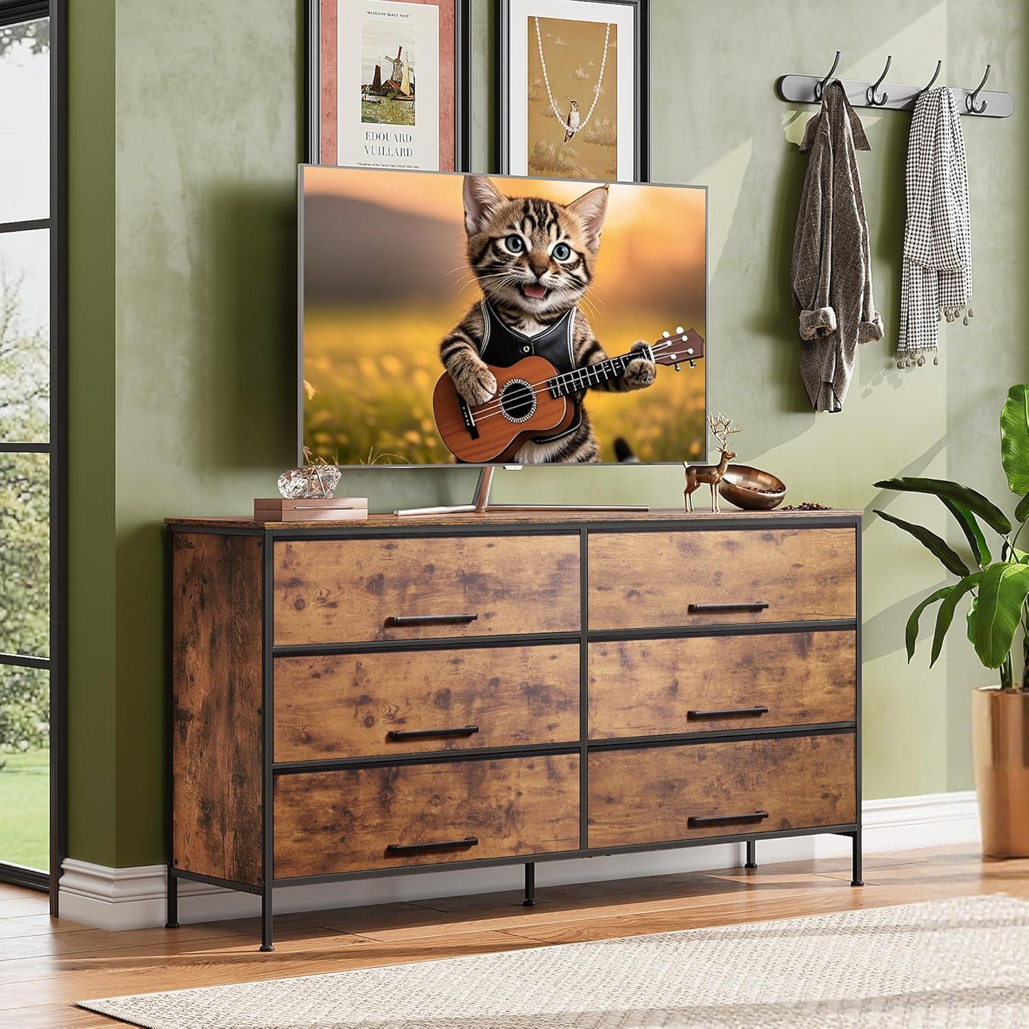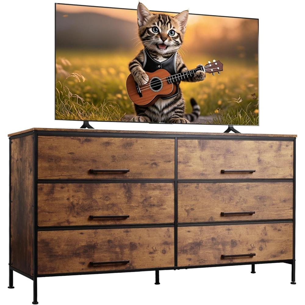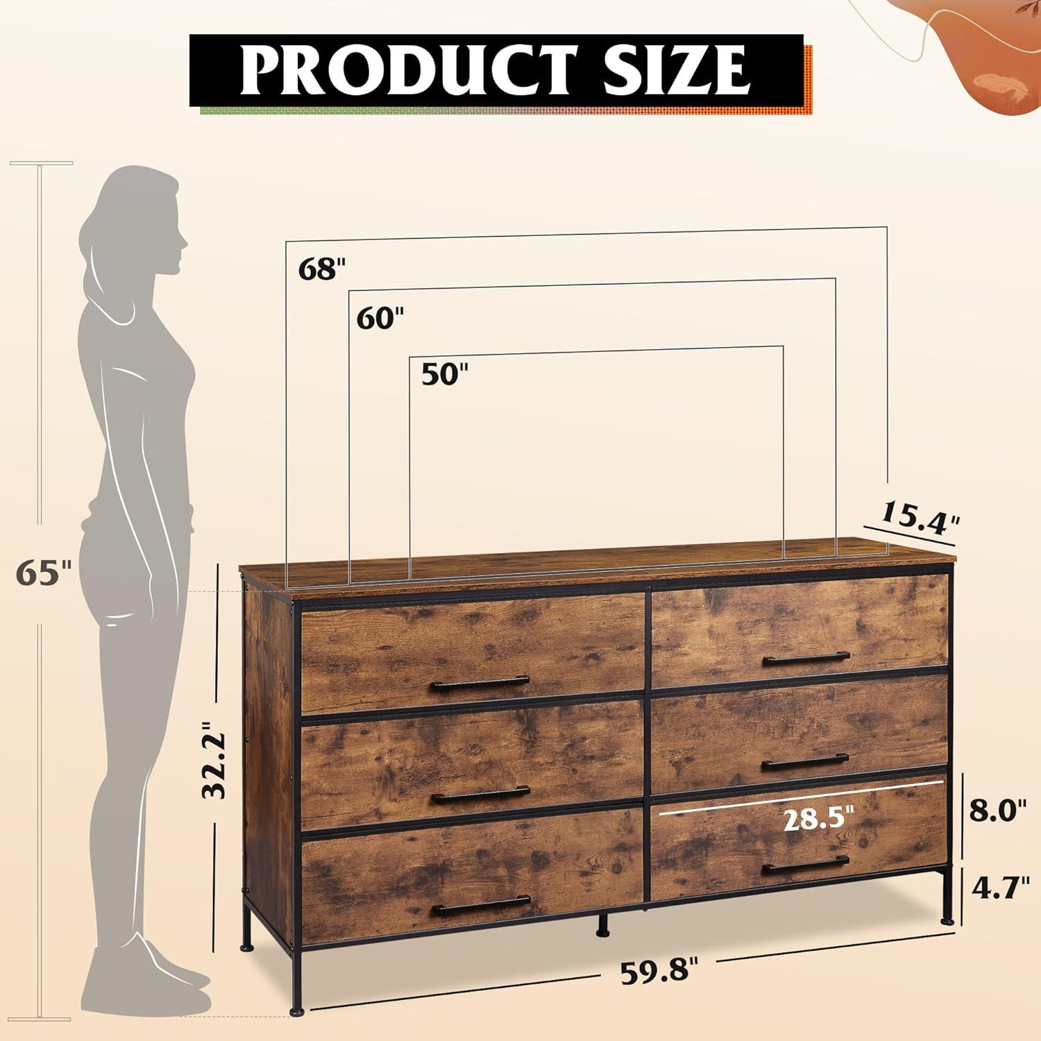 WLIVE Wide TV Stand for 60, 65, 70 inch TV, Large Entertainment Center with 6 Fabric Drawer, TV Media Console Table with Wood Top, Adjustable Feet for Living Room, Hallway, Rustic Brown