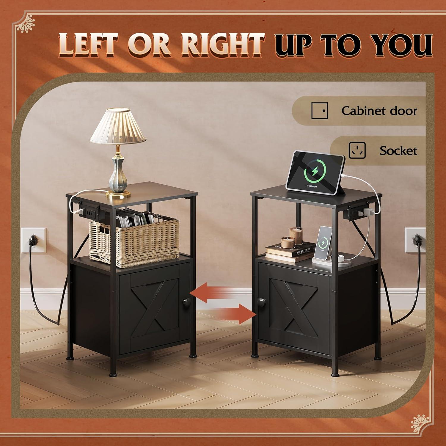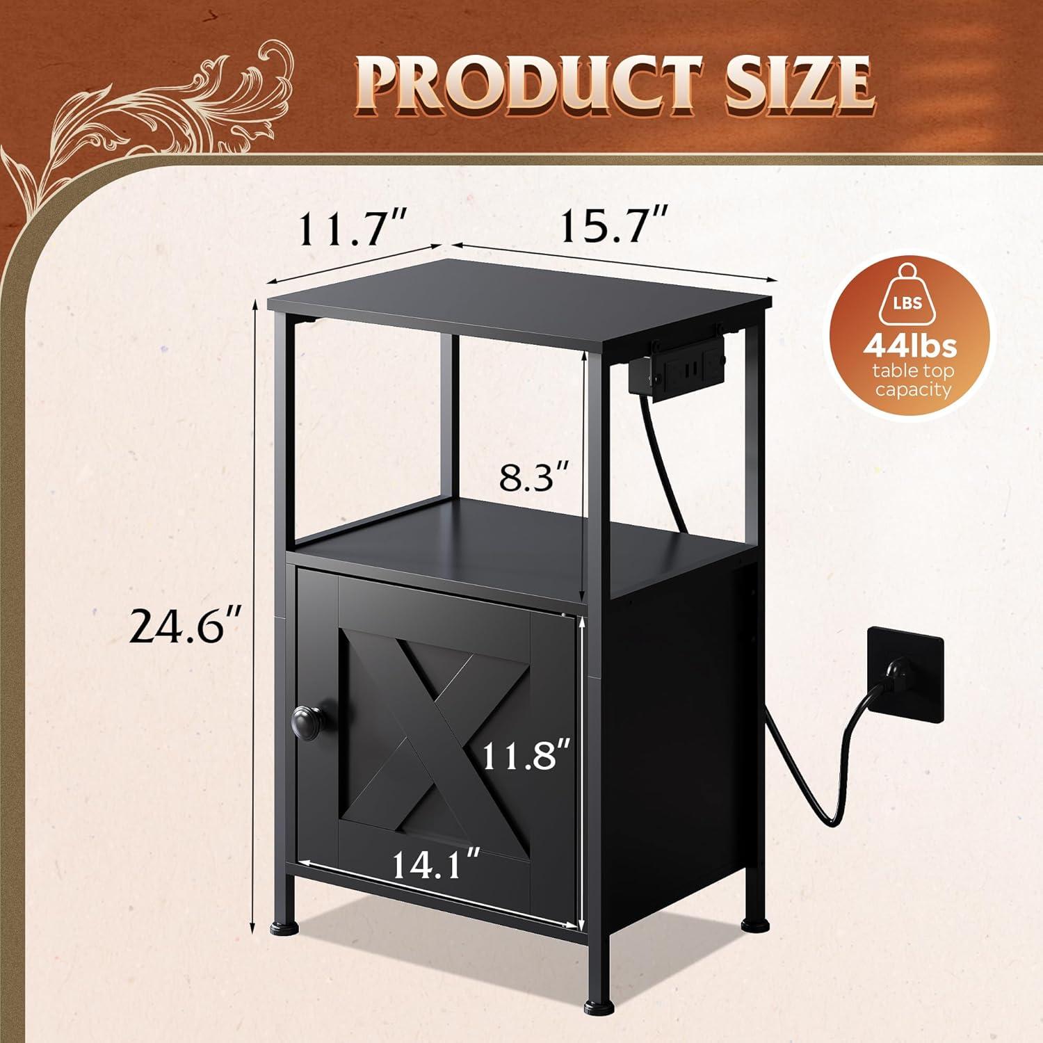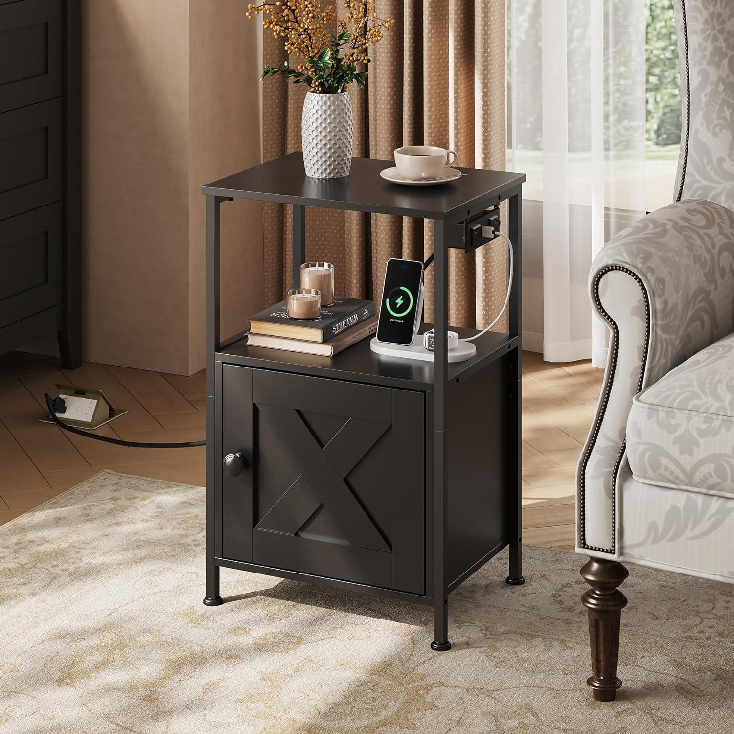 WLIWLIVE End Table with Charging Station, Bed Side Table with Open Shelf and Cabinet, Farmhouse Night Stand, End Tables Living Room, Bedroom, Small Spaces, White and Greige(Black)